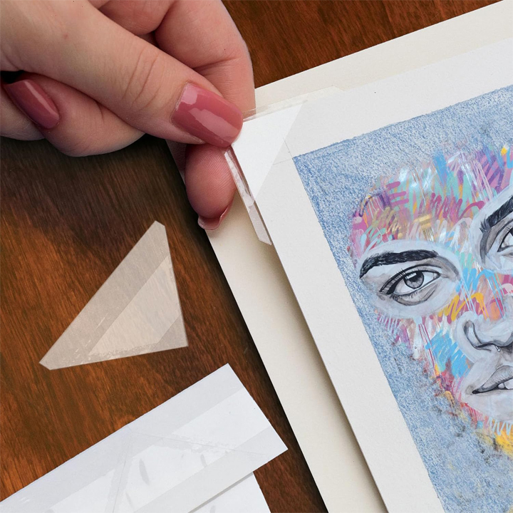Trap your art and photos in place without letting adhesive contact them. Use these triangular mounting corners which are similar to the corners in an old time photo album, only bigger, stronger and clear.