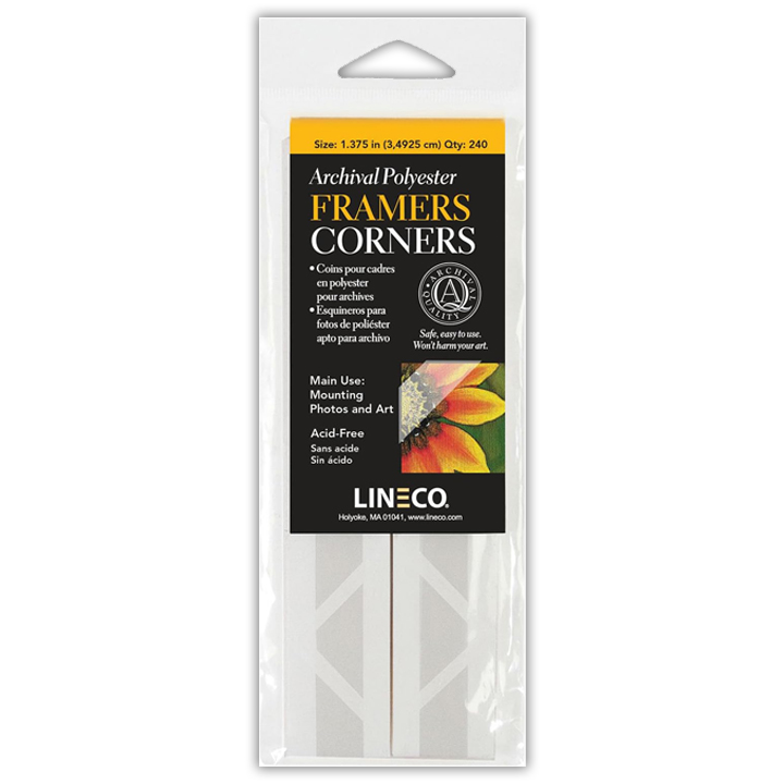 Each box contains 240 see-through self-adhesive corners. Available in two sizes. The smaller corners, called Photo Corners, are ideal for photographic prints. The larger corners, called Framer’s Corners, are for larger artwork.