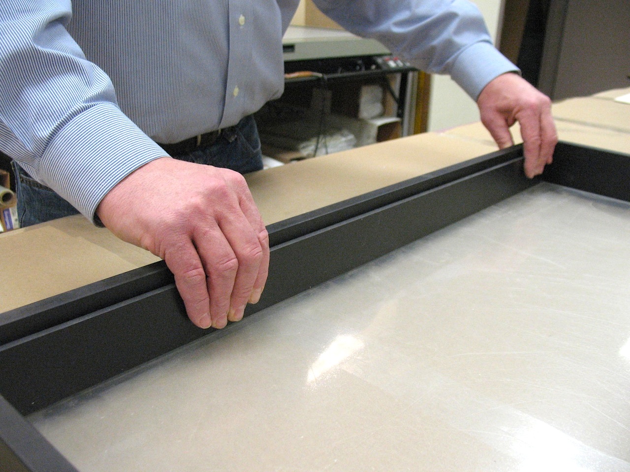 Press the panels against the inside walls of the frame until they adhere. The bottom of each panel will rest against the back of the acrylic (Plexiglass).