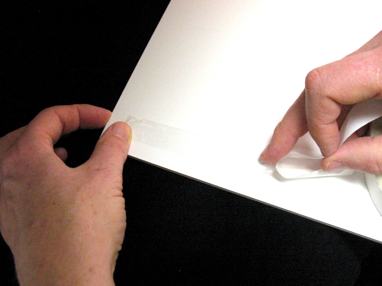 Stitchery tape is a double-sided tape for fastening fabric to a mounting surface. Peel back the white release paper to expose both sides of the adhesive and adhere the tape to the surface of the foam board.